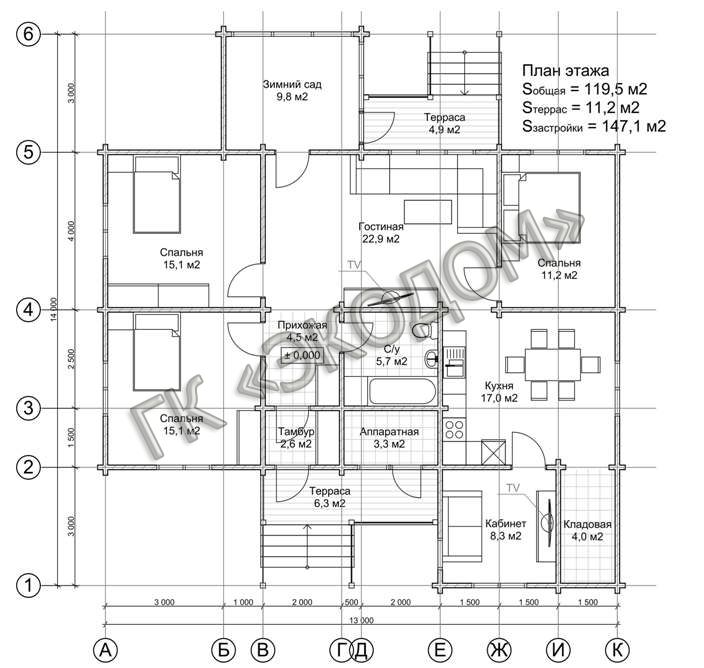 Компактность — вот одно из основных требований, предъявляемых к жилым домам на небольших загородных участках. Но это вовсе не означает, что на стандартной «шестисотке» можно построить только домик для семьи из трех человек. Дом из клееного бруса площадью 117,8 кв.м. имеет размеры 8500х8500 и занимает совсем немного места на участке. В то же время в этом доме в двух уровнях есть все необходимое. Просторная гостиная, уютная и функциональная кухня-столовая, санузел, прихожая, холл и котельная с отдельным входом с террасы — это только на первом этаже. А наверху — две спальни, санузел и удобный рабочий кабинет.