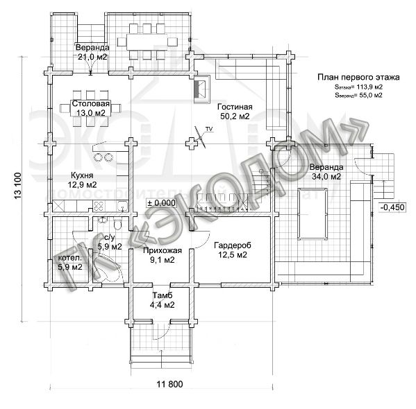 Южная и Восточная веранды дома (вероятнее всего, именно так хозяева будут называть из в разговоре) станут логичным продолжением столовой и гостиной и еще больше расширят свободное, ничем не ограниченное пространство первого этажа. Прекрасно оборудованная кухня, санузел, большая гардеробная комната и приветливо встречающая своих друзей прихожая довершают картину первого этажа.