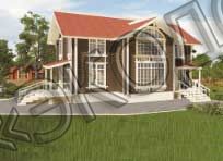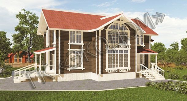 Клееная балка перекрытий, цементно-пещаная черепица Braas, большие окна с фальш-переплетом, красивый фасад с резными элементами.